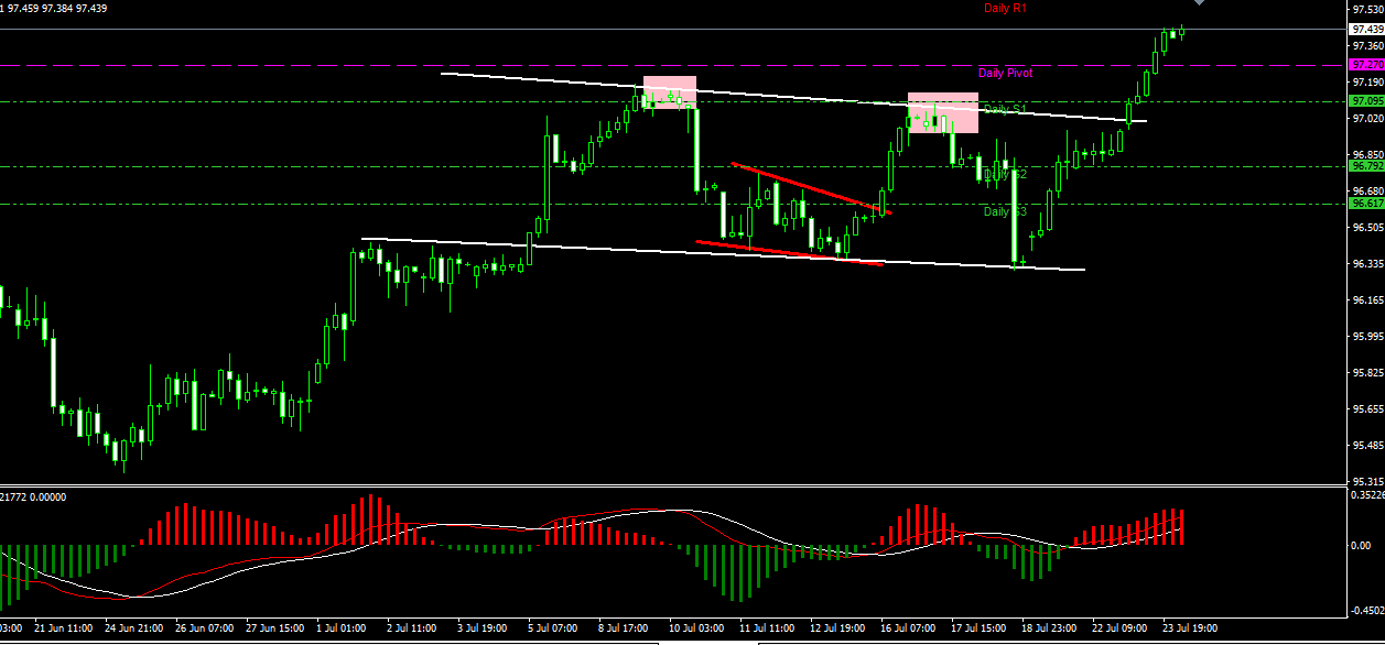 上一交易日,价格对关键的97.10位置形成了突破,并站上了震荡通道的上轨,由此可见此前的双顶猜测并未成立,而是价格在通道内的第五浪形成了有效突破,从而构筑了上升旗形盘整结构。目前来看,多头动能非常强势,价格并未出见顶信号,日内初步压力位于97.57,突破后则有望看向97.75一线。